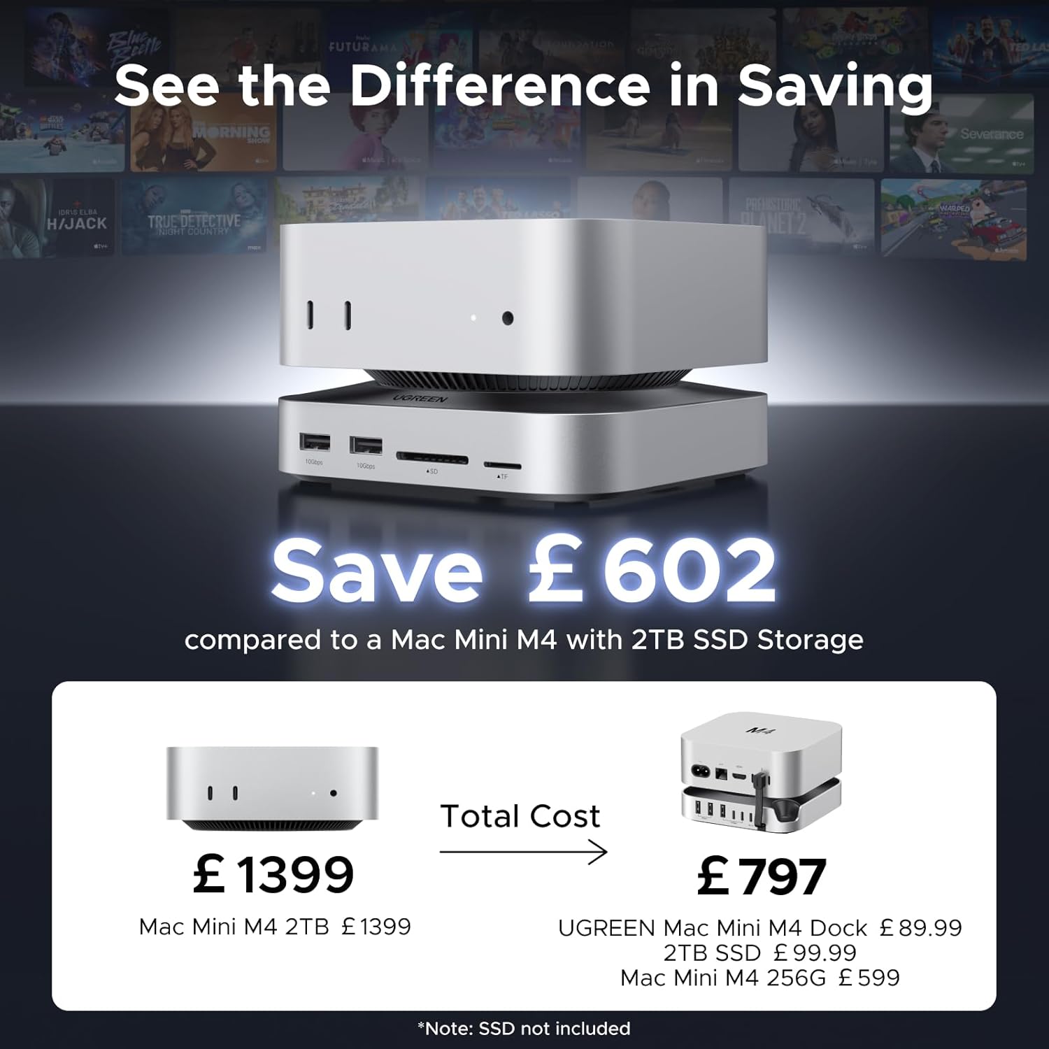 UGREEN 11-port Mac mini M4 docking station and stand with 10Gbps USB connectivity and NVMe SSD storage expansion up to 8TB.