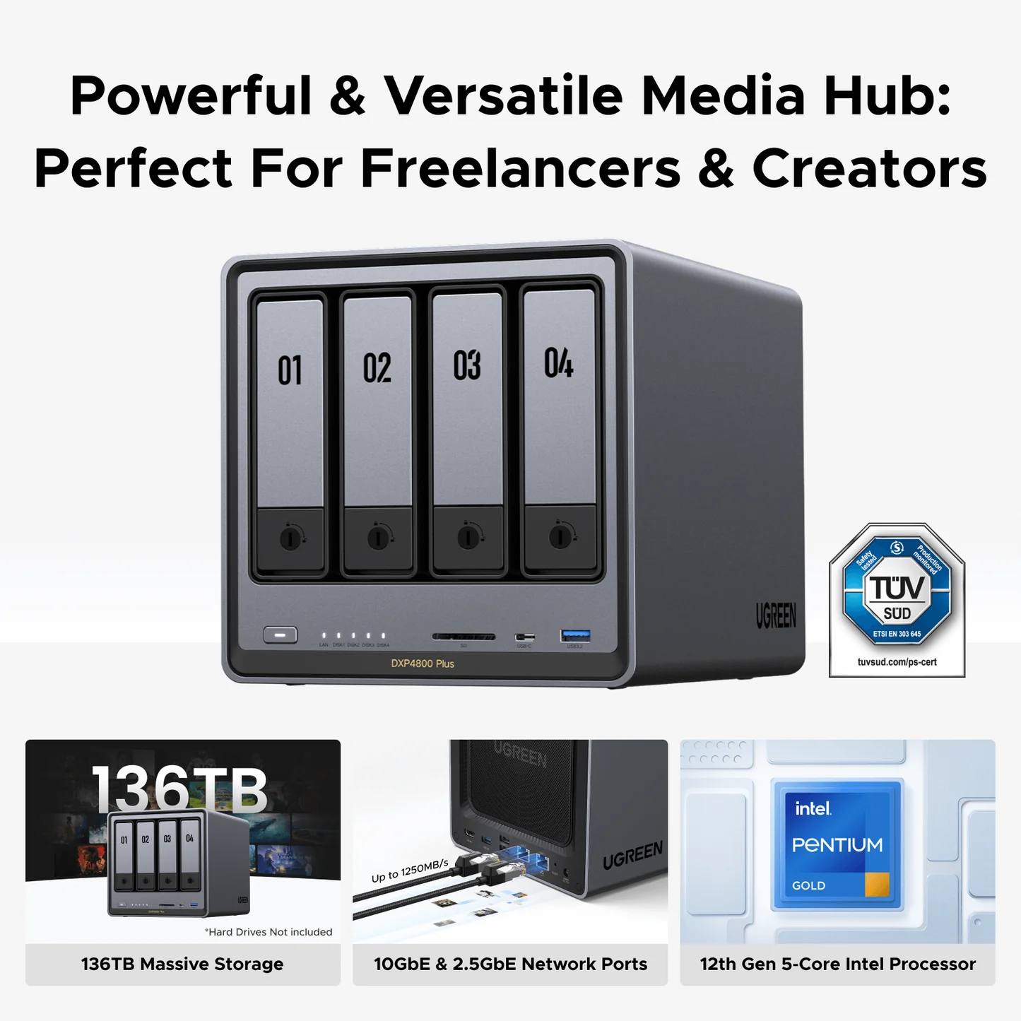 High-performance UGREEN NASync DXP4800 Plus 4-bay NAS enclosure with Intel Pentium processor and dual 10GbE networking for scalable storage and fast file access.