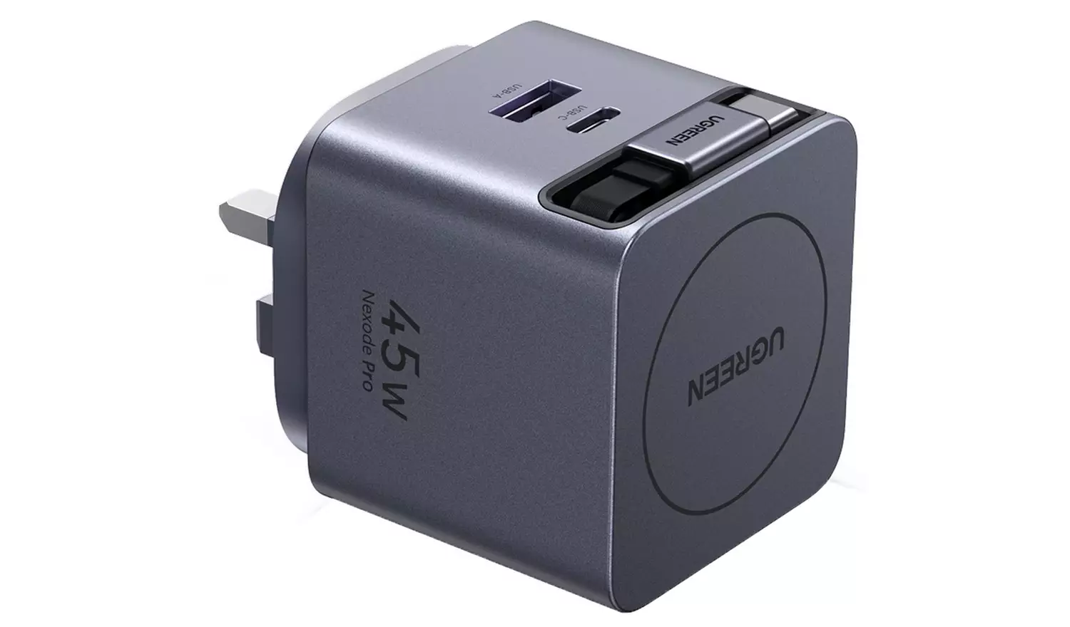 Compact UGREEN Nexode Pro 45W GaN charger with retractable USB-C cable and multi-port fast charging for phones, tablets and laptops.