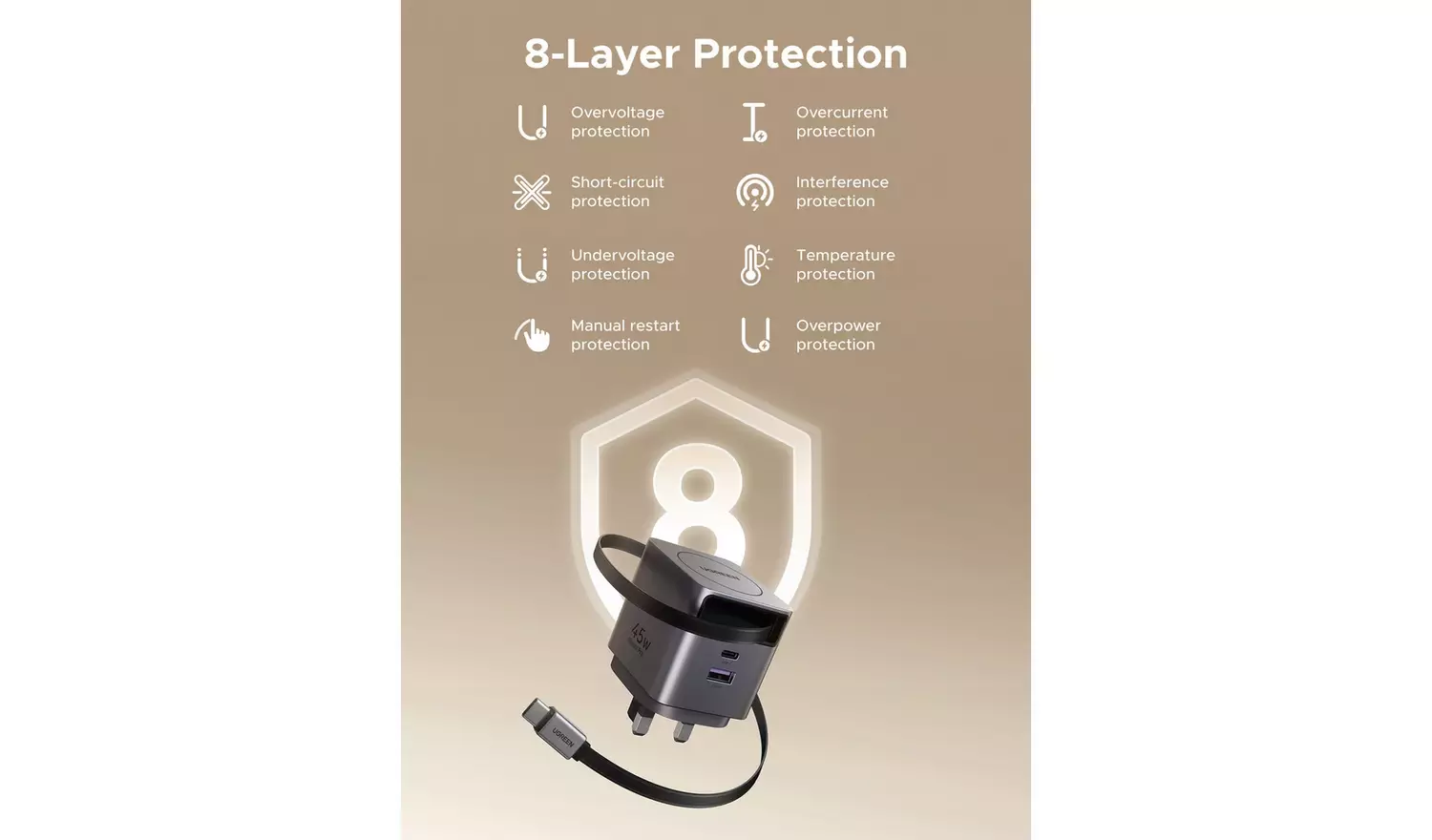 The charger supports several fast-charging protocols, including USB Power Delivery and Quick Charge, ensuring compatibility across a wide range of devices. Integrated protection features help safeguard against overheating, over-current and short circuits, helping maintain safe and stable charging performance.